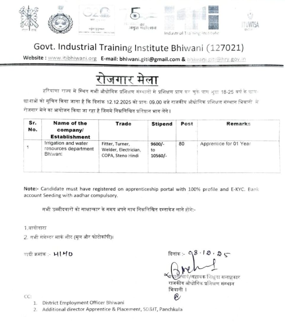 Bhiwani Irrigation Department Vacancy 2025: 80 पदों पर भर्ती – वॉक-इन इंटरव्यू : Government ITI, Bhiwani द्वारा Irrigation and Water Resources Department में ITI पास उम्मीदवारों के लिए 80 Apprenticeship / Pre Placement Offer के अवसर जारी किए गए हैं। यह Walk-In Interview आधारित भर्ती है, जिसमें किसी भी प्रकार का ऑनलाइन या ऑफलाइन आवेदन नहीं भरना है। इच्छुक उम्मीदवार सीधे 12 दिसंबर 2025 को Govt. ITI Bhiwani पहुँच सकते हैं। इस भर्ती से जुड़ी सभी आवश्यक जानकारी — पात्रता, योग्यता, आयु सीमा, दस्तावेज, चयन प्रक्रिया, इंटरव्यू लोकेशन आदि — नीचे विस्तार से दी गई है।