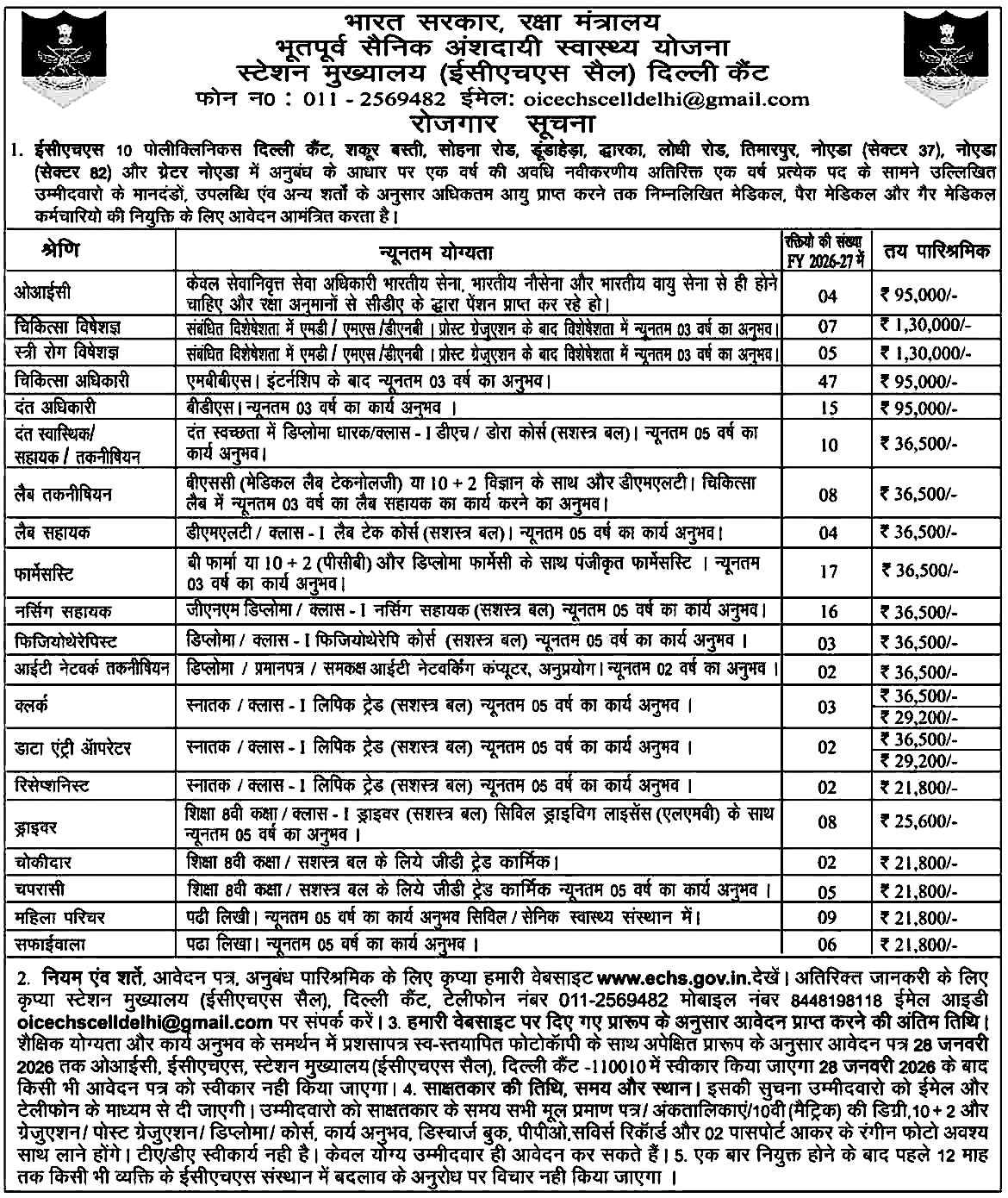 भूतपूर्व सैनिक अंशदायी स्वास्थ्य योजना स्टेशन मुख्यालय (ECHS CELL) द्वारा जारी अधिसूचना के अनुसार कुल 95 पदों के लिए भर्ती विज्ञापन जारी किया गया है । जिसमें पदों को विभिन्न श्रेणियों के अनुसार विभाजित किया गया है, जिसे आप आधिकारिक अधिसूचना में देख सकते हैं।ECHS Delhi Vacancy 2026 योग्यता