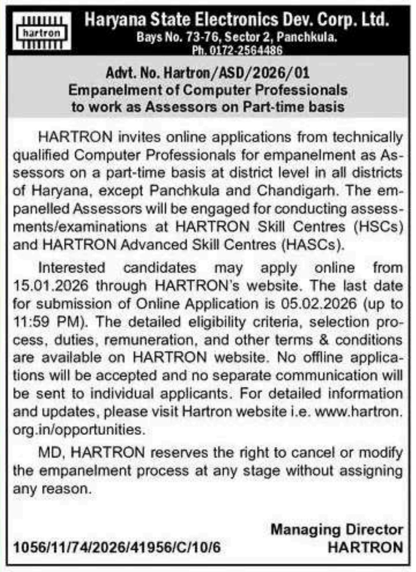 HARTRON Computer Professionals Recruitment 2026 अधिसूचना: हरियाणा राज्य इलेक्ट्रॉनिक्स विकास निगम लिमिटेड ने अपनी आधिकारिक वेबसाइट पर HARTRON Computer Professionals Recruitment 2026 की अधिसूचना जारी की है। इसके लिए योग्य उम्मीदवार 15 जनवरी 2026 से 02 फ़रवरी 2026 तक आधिकारिक वेबसाइट पर ऑनलाइन आवेदन कर सकते हैं। हम आपको इस भर्ती से संबंधित पूरी जानकारी नीचे देंगे।