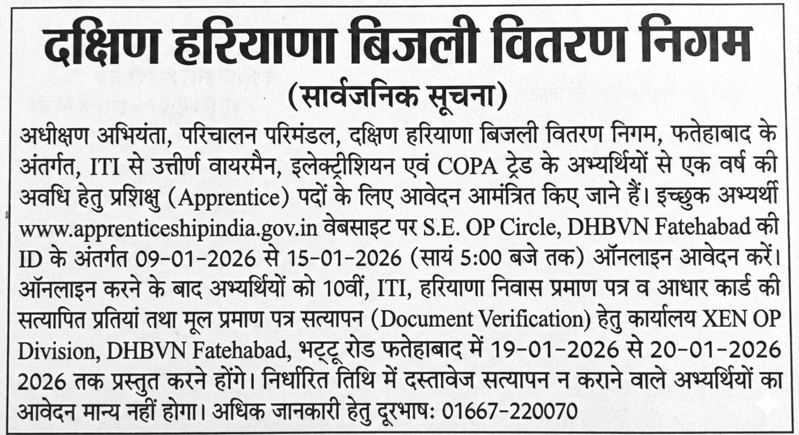 Haryana BIJLI Board Vacancy 2026 |  हरियाणा पावर यूटिलिटीज DHBVN ने विभिन पदो के लिए भर्ती का नोटिफिकेशन जारी किया है। इच्छुक और योग्य उम्मीदवार इसके लिए ऑनलाइन आवेदन कर सकते हैं। आवेदन की प्रक्रिया 09 जनवरी 2026 से शुरू हो चुकी है और इसकी अंतिम तिथि 15 जनवरी 2026 है। अगर आप 10वी, 12वी, स्नातक पास हैं और बिजली विभाग में नौकरी का सपना देखते हैं तो यह आपके लिए एक सुनहरा मौका है।