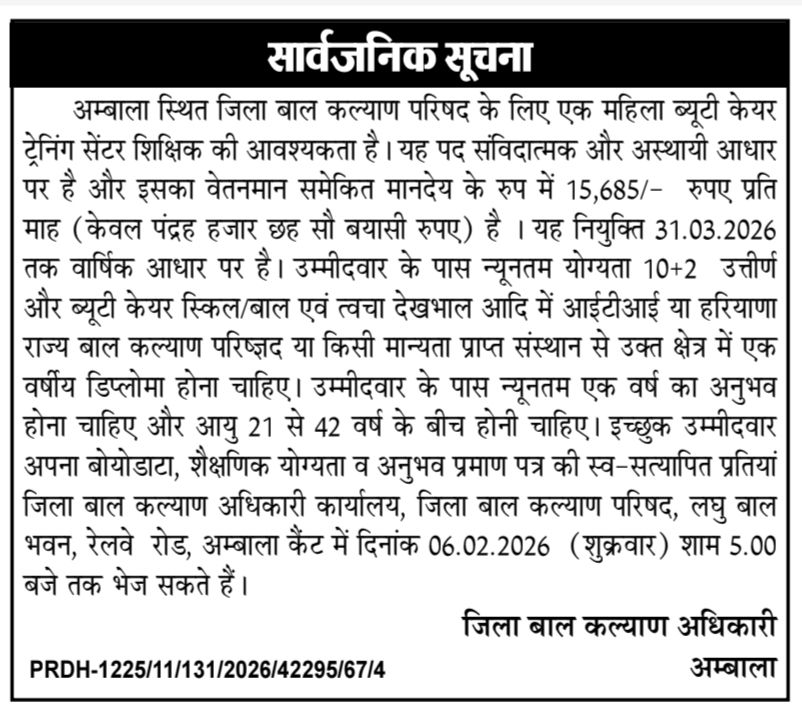 Haryana District Child Welfare Council Vacancy 2026: जिला बाल कल्याण परिषद अंबाला ने अपनी आधिकारिक वेबसाइट पर Haryana District Child Welfare Council Vacancy 2026 की अधिसूचना जारी की है । इसके लिए पात्र उम्मीदवार आधिकारिक वेबसाइट पर 22 जनवरी से 06 फ़रवरी 2026 तक ऑफ़लाइन आवेदन कर सकते हैं । हम आपको इस भर्ती के बारे में पूरी जानकारी नीचे देंगे। भर्ती की आधिकारिक अधिसूचना 22 जनवरी 2026 को जारी कर दी गई है।