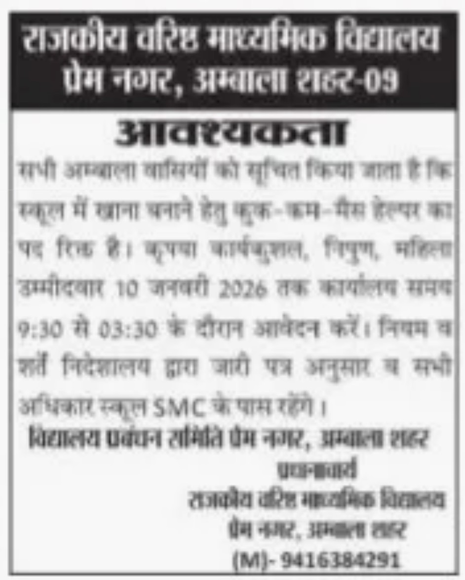 Haryana Mid Day Meal Worker Vacancy 2026: हरियाणा शिक्षा विभाग ने अपनी आधिकारिक वेबसाइट पर हरियाणा मिड डे मील वर्कर वैकेंसी 2026 की अधिसूचना जारी कर दी है। इसके लिए पात्र उम्मीदवार 31 दिसंबर 2025 से 10 जनवरी 2026 तक आधिकारिक वेबसाइट पर ऑफ़लाइन आवेदन कर सकते हैं। हम आपको इस भर्ती के बारे में पूरी जानकारी नीचे देंगे।
