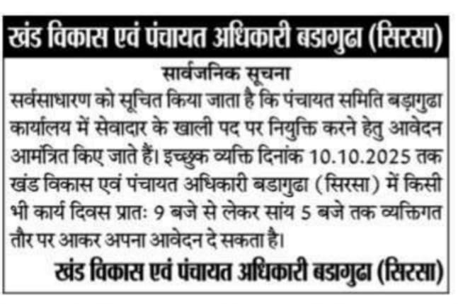 आवेदन इस पते पर खुद जाके जमा कराए – “खण्ड विकास एवं पंचायत अधिकारी कार्यालय, बड़ागुड़ा (सिरसा)”