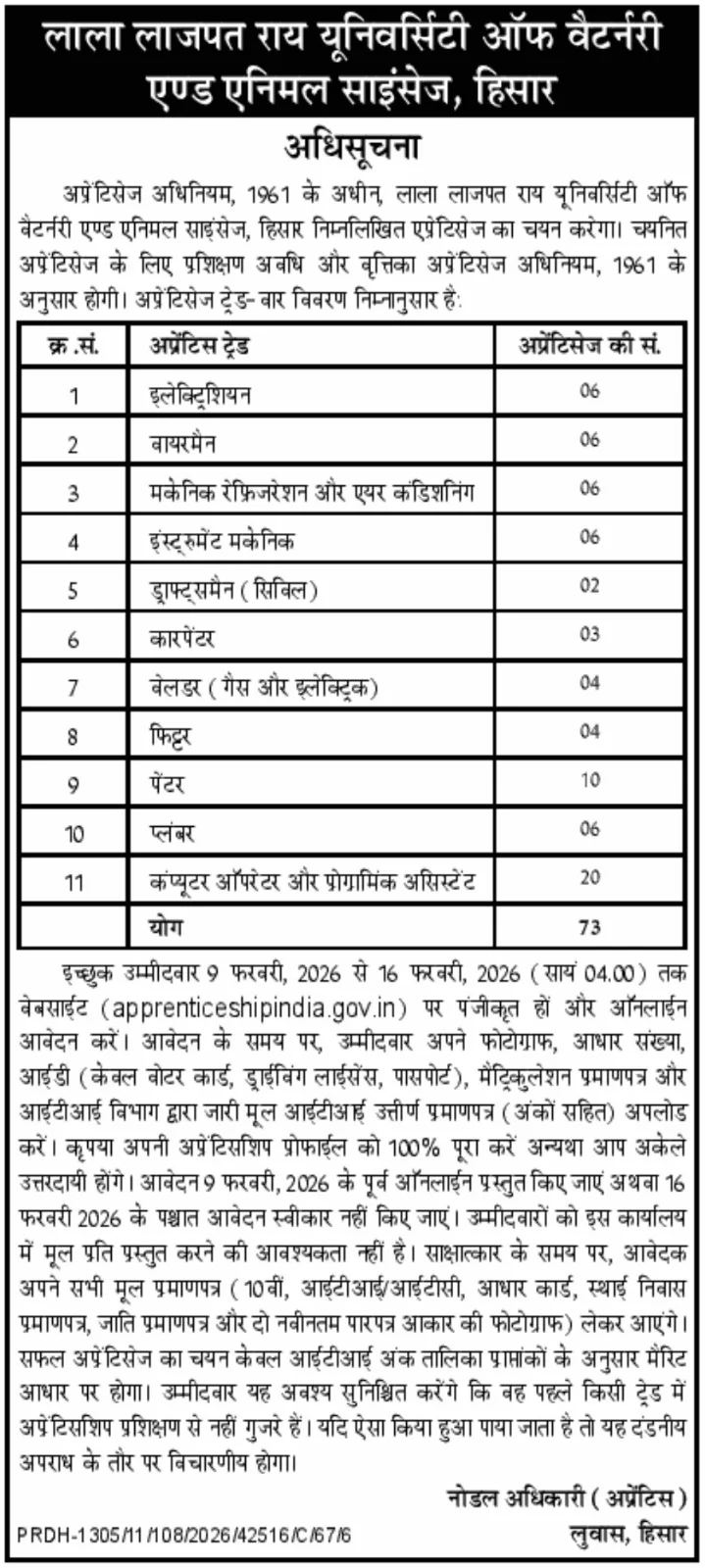 Hisar LUVAS के लिए ऑनलाइन आवेदन का पोर्टल 09 फ़रवरी 2026 को खोला गया है । जिसमे हरियाणा निवासी अपना आवेदन जमा करा सकते है। भर्ती के लिए अंतिम तिथि 16 फ़रवरी 2026 है।