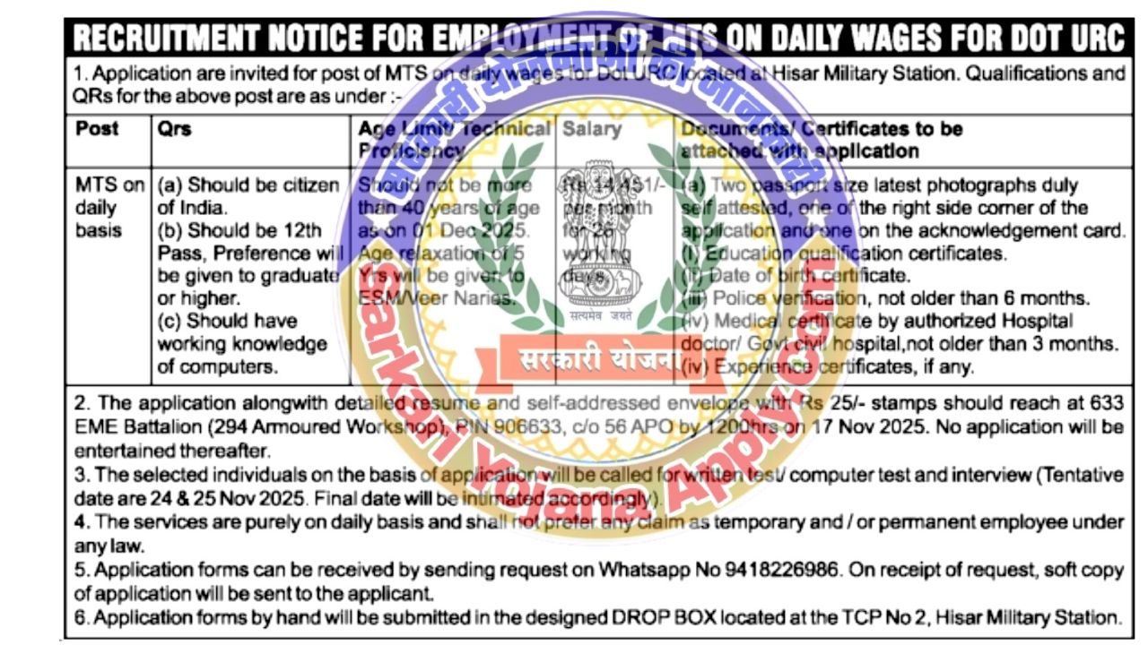 | MTS (Multi Tasking Staff) – Daily Basis | अधिकतम आयु 40 वर्ष (01 दिसम्बर 2025 तक), ESM/Veer Naries को 5 वर्ष की छूट | Hisar Military Station |