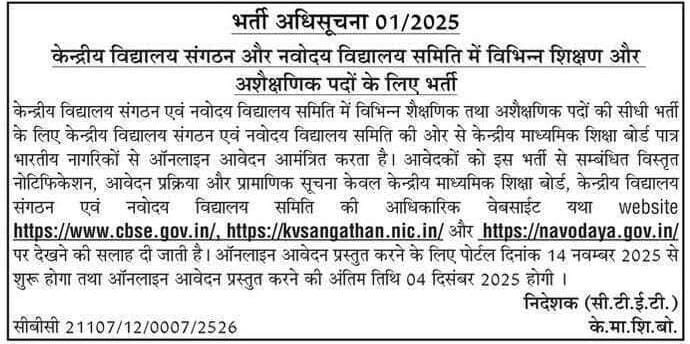 KVS NVS Teaching and Non-Teaching Vacancy 2025: केंद्रीय विद्यालय संगठन (KVS) ने KVS NVS टीचिंग और नॉन-टीचिंग भर्ती 2025 का आधिकारिक नोटिफिकेशन जारी कर दिया है। इस भर्ती के तहत 10000+ पदों पर योग्य उम्मीदवारों से ऑनलाइन आवेदन मांगे गए हैं। इच्छुक उम्मीदवार 14 नवंबर 2025 से 4 दिसंबर 2025 तक आवेदन कर सकते हैं। इस भर्ती से जुड़ी सभी जानकारी जैसे – योग्यता, आयु सीमा, आवेदन प्रक्रिया, फीस, चयन प्रक्रिया और अन्य जरूरी डिटेल नीचे दी गई है।
