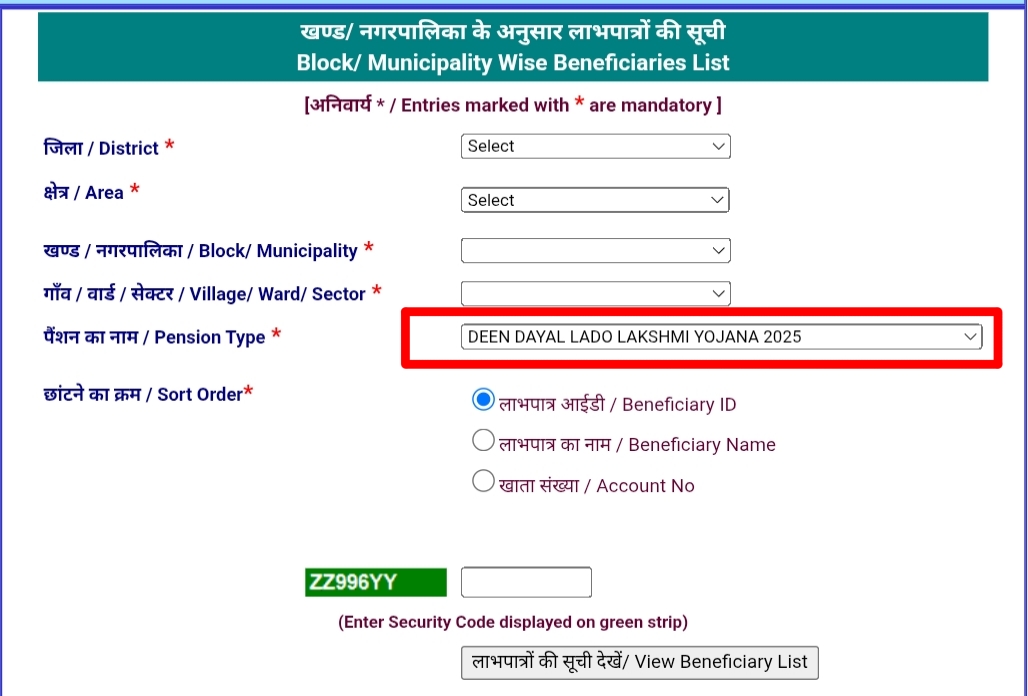 - चरण 3 : दिखाई देने वाले नए पृष्ठ पर आवश्यक विवरण जैसे जिला, क्षेत्र, ब्लॉक / एमसी, गांव और पेंशन प्रकार (दीन दयाल लाडो लक्ष्मी योजना/Deen Dayal Lado Lakshmi Yojana), छांटने का क्रम (Sort Order) का चयन करें।