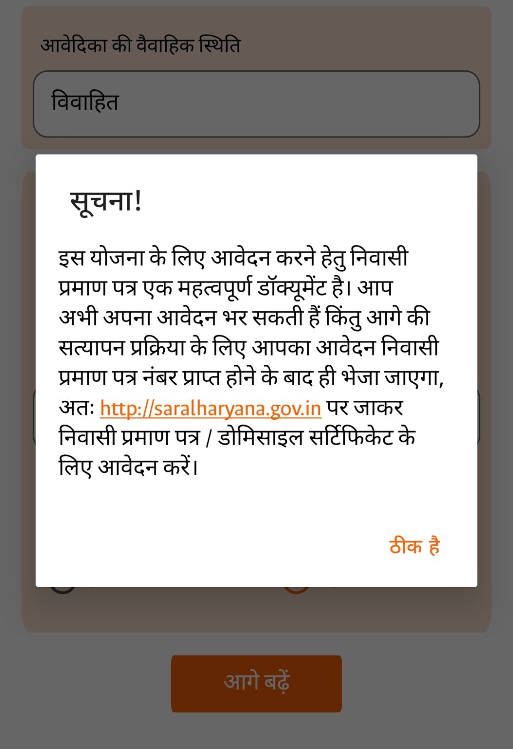 - ध्यान देने योग्य: अभी के लिए हरियाणा की महिलाएं बिना डोमिसाइल अपना आवेदन भर सकती है परंतु सत्यापन प्रक्रिया के लिए आपका आवेदन निवास प्रमाण पत्र प्राप्त होने के बाद ही आपका फॉर्म वेरीफाई किया जाएगा।