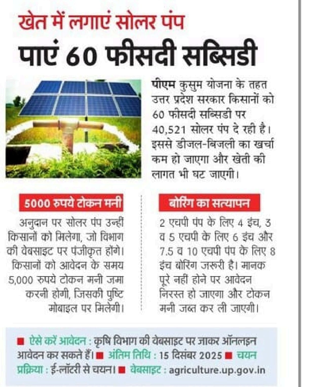 PM Kusum Solar Water Pump Yojana 2025 : किसानों के लिए सोलर पम्प पर भारी सब्सिडी, अभी करें बुकिंगकृषि विभाग द्वारा वर्ष 2025 के लिए पीएम कुसुम सोलर वाटर पम्प योजना के तहत किसानों को 60-75% सब्सिडी पर सोलर पम्प उपलब्ध कराए जा रहे हैं। अगर आप भी अपने खेतों में सिंचाई के लिए सोलर पम्प लगाना चाहते हैं, तो आपके लिए यह योजना बेहद महत्वपूर्ण है। विभाग द्वारा ऑनलाइन बुकिंग पोर्टल 26 नवंबर 2025 से 15 दिसंबर 2025 तक के लिए खोल दिया गया है। इस तिथि के बाद किसी भी प्रकार की बुकिंग नहीं की जाएगी, इसलिए किसान समय पर अपना पंजीकरण एवं बुकिंग अवश्य करें।