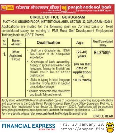 पंजाब नेशनल बैंक गुरुग्राम ने 22 जनवरी 2026 को PNB Bank Vacancy की अधिसूचना जारी की। जिसमें ऑफ़लाइन आवेदन की प्रारंभिक तिथि 24 जनवरी 2026 है , और आवेदन की अंतिम तिथि 10 फ़रवरी 2026 है। भर्ती के लिए परीक्षा तिथि की जानकारी बाद में बोर्ड द्वारा आधिकारिक साइट पर अपडेट की जाएगी।