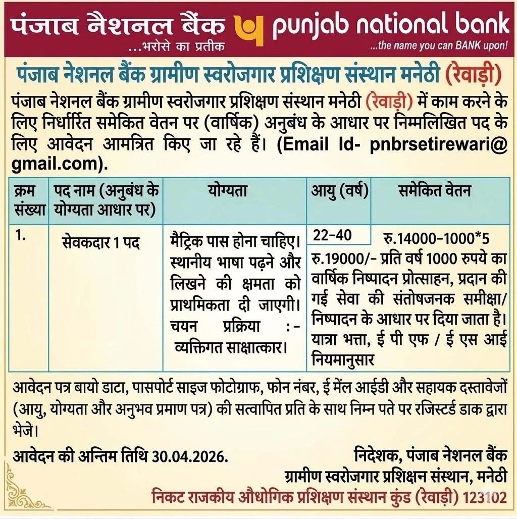 भर्ती संगठनपंजाब नेशनल बैंक रेवाड़ी