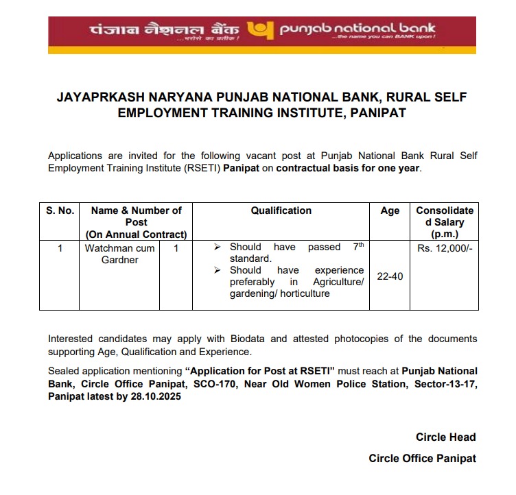 PNB Bank Watchmen Vacancy  2025 अधिसूचना: पंजाब नेशनल बैंक ने अपनी आधिकारिक वेबसाइट पर PNB Bank Watchmen Vacancy  2025 का अधिसूचना जारी कर दिया है। इसके लिए योग्य उम्मीदवार 18 अक्टूबर  से 28 अक्टूबर 2025 तक  आधिकारिक वेबसाइट पर ऑफलाइन आवेदन कर सकते हैं। हम आपको इस भर्ती की पूरी जानकारी नीचे देंगे। भर्ती की आधिकारिक अधिसूचना 18 अक्टूबर 2025 को जारी कर दी गई है, जिसे नीचे दिए गए लिंक से डाउनलोड किया जा सकता है। इस भर्ती से संबंधित सभी विवरण जैसे अधिसूचना, योग्यता, आयु सीमा, पात्रता, परिणाम, पिछले प्रश्नपत्र, ऑनलाइन आवेदन कैसे करें, परीक्षा तिथि, उत्तर कुंजी, पाठ्यक्रम और एडमिट कार्ड की महत्वपूर्ण तिथियां, आवेदन शुल्क, वेतन आदि नीचे दिए गए हैं।