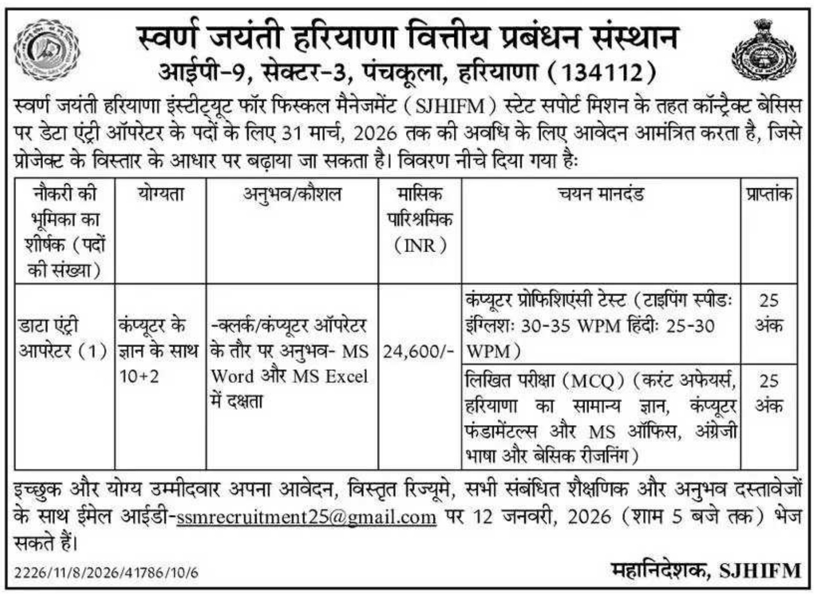 SJHIFM Panchkula Vacancy 2026: स्वर्ण जयंती हरियाणा इंस्टीट्यूट फॉर फिस्कल मैनेजमेंट (एसजेएचआईएफएम), पंचकुला आपको सूचित करता है कि संविदा आधार पर डेटा एंट्री ऑपरेटर के पदों के लिए आवेदन आमंत्रित किए गए हैं । सभी पात्र उम्मीदवारों के लिए आवेदन की प्रारंभिक तिथि 07.01.2026 है । रिक्ति आवेदन जमा करने की अंतिम तिथि 12.01.2026 है । इस भर्ती से संबंधित जानकारी नीचे दी गई है।